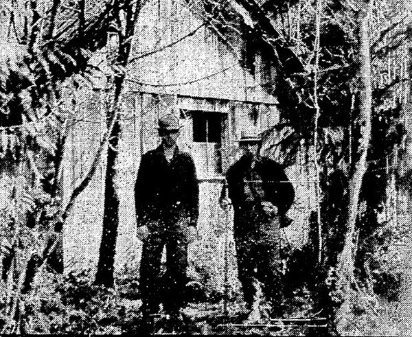 Abandoned and lost since the beginning of the century, a shack in the cedar swamp south of the Forks Shingle Mill was found a few weeks ago by Herman Smith and Eugene Case. Pictures of the two men and the shack, and pictures of old newspapers found there were taken by Ray Goss and reproduced on Sunday’s Seattle Times.