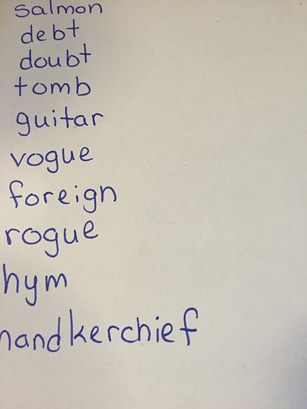 Due to my humanisticism in regards to the occasional questioning of legitimate words, when my daughter showed me her spelling list (which was handwritten by her teacher), I thought that maybe “hym” was a real word. The fact that they are currently working on silent letter words kind of threw me for a loop though. Which letter in that word is silent? Is it pronounced “hi” or “yim”?