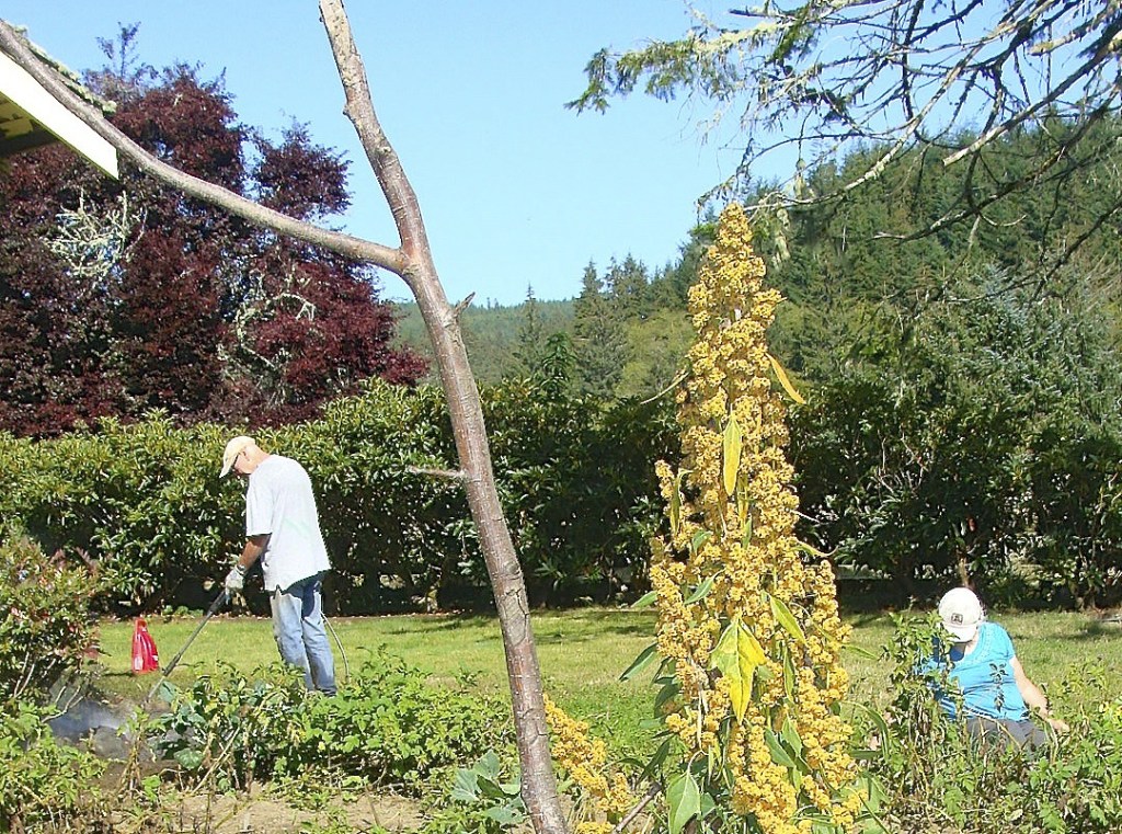 Brian McLean is pressure washing the sidewalks and yard art. Liz Stubbs is weeding the flower gardens. Joanna McLean and Nancy Messmer are thinning the carrots and beets and weeding the potato patches. Roy Morris is weeding and watering the demonstration plots. They are Friends of Hoko River State Park, preparing the gardens for the annual harvest celebration.