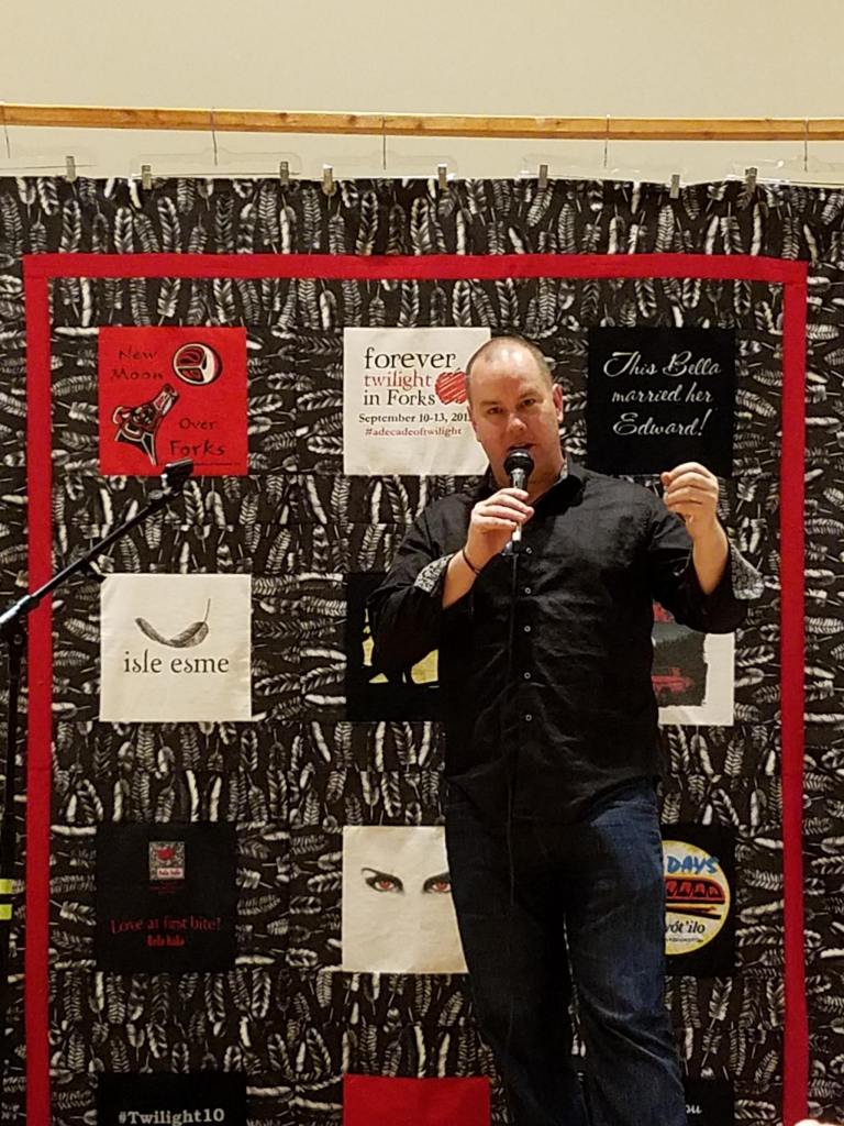 Betsy Davis, a Twilight fan from Mt. Airy, North Carolina, was in my T-shirt class, and her quilt was the one behind Jack Morrissey at the welcome talk that he did on Wednesday night opening the Forever Twilight in Forks Festival. Betsy, her husband, and her friend stayed a week longer and came into the Visitor Center the following Monday to say goodbye to everyone. I was so glad that I was working that day to say “goodbye,” too.