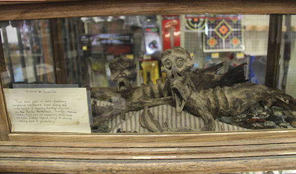 Now the getting weirder part: A few years ago he acquired two dried out creatures in a case. Their names are Wilbur and Lucille and the note on the case says they are from the Pacific Northwest. They appear to be part fish and part …? I think they are from Texas. And more recently Stark has become the proud owner of a set of bones, human bones. You will just have to go check them out.