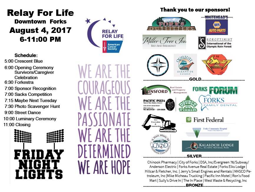 Relay For Life is back to “Finish the Fight” against cancer with a street fair in downtown Forks on Aug. 4 from 6-11 p.m. “Friday Night Lights” is the sports-related theme for this year’s event. Entertainment will start on the steps of the RAC at 5 p.m. with Crescent Blue. At 6 p.m. Forks Avenue will be closed to traffic for a street fair and dance.