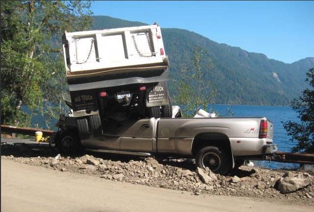 The Washington State Patrol reports that this morning at about 9:50 a.m., a 2012 International dump truck driven by Tingley Walker, age 33, of Sedro Wooley was eastbound on US Hwy 101 at MP 223.5. A second vehicle a 2009 Toyota Tacoma driven by James Murry age 68 of Sequim and a third vehicle a 2007 Chevy Silverado driven by Maryann Beck age 64 of Sequim, were westbound on US Hwy 101 at MP 223.5. The dumptruck left the roadway to the right, overcorrected to the left, overturned, lost its load of rocks, striking the Toyota pickup then coming to rest on top of the Chevy Silverado pickup. The roadway was fully and partially blocked for three hours and 42 minutes.