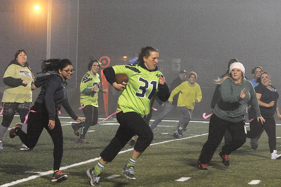 In the Powder Puff Flag Football Fundraiser at Spartan Stadium on Nov. 16, Cassi Romberg takes the handoff and scampered 30 yards through the fog to the end zone. Competing were two teams from the Forks Community Hospital. With the proceeds going to the United Way, they were no doubt the winners.