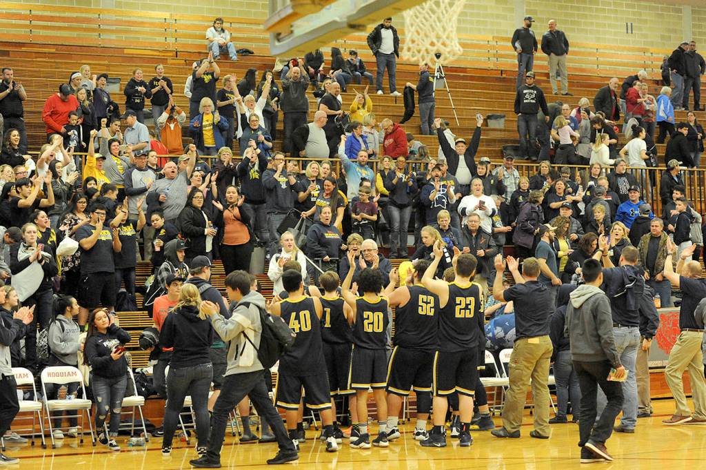 After defeating Hoquiam 64-55 to take the Evergreen 1A league championship, members of the Forks Spartan boys basketball team gave a standing ovation to the large group of Forks supporters who made the trip to Hoquiam Feb. 1 to help boost both the boys and girls teams to victory. The girls defeated Hoquiam 60-43. Both Forks teams are to play in the district tournament. The boys are scheduled to play the number four Trico League team in Forks at 7 p.m. Thursday Feb 7, while the girls are to travel south to King’s Way Christian Friday Feb. 8 for a 7 p.m. contest against the Trico League champions. Photo by Lonnie Archibald.