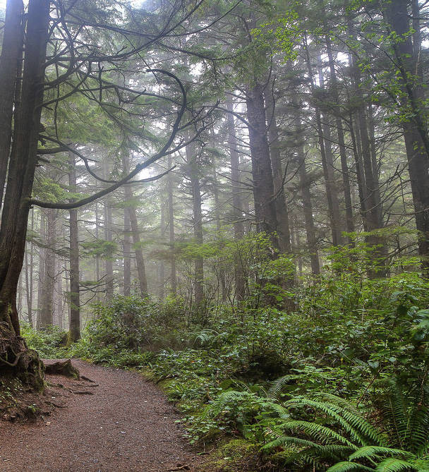 I turn off the main trail through ancient trees, six feet in diameter, that have died of old age and fallen across each other a long time ago. New trees are sprouting from the decaying wood, growing roots that straddle the mother trees. I work my way climbing over and around these huge fallen giants. In between the stacks of 125’ timbers are walled in pockets, creating rooms of forest floor covered in thick layers of moss. Under these rotting trees are sometimes found what seems to be a den tucked back in a hollowed cave of trees. I have seen these cavities before and I really don’t want to find a bear, or bobcat, cougar, or any animal for that matter.
