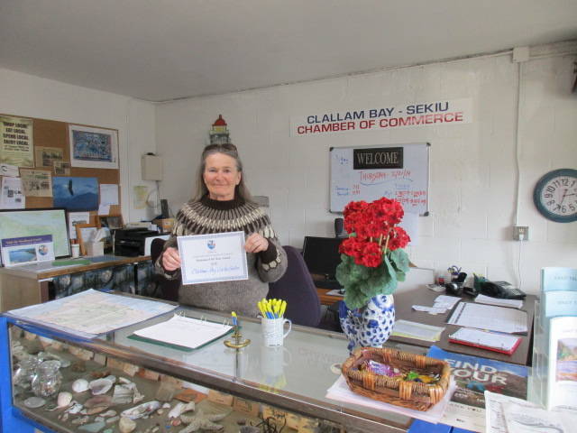 Business: The Clallam Bay Visitor Center for continuing to welcome and provide great information to tourists from all over the world, along with locals, too! The building is attractive and full of maps, local photos, natural and historical artifacts and information. Karin Ashton, Volunteer Coordinator, has done a great job keeping it open and running and accepted the award certificate on behalf of the Visitor Center.