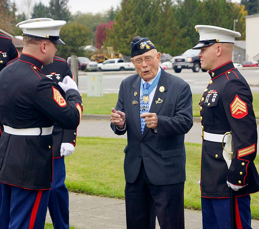 Hershel “Woody” Williams was the Keynote Speaker. The GSFM project was started by Woody so that those lost are never forgotten. Here he visits with some of the US Marines that served as color guard and offered a 21 Gun Salute at the end of the Dedication Ceremony. Photo Vern Hestand