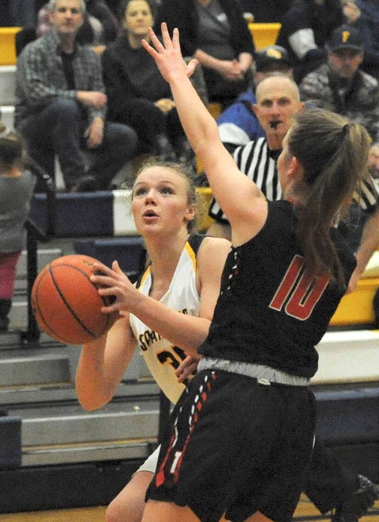 At right, Spartan Kyra Neel eyes the basket against Tenino’s Grace Vestal Jan. 7 in Forks where the Beavers defeated the Spartans 45-27 in this league contest. Photo by Lonnie Archibald