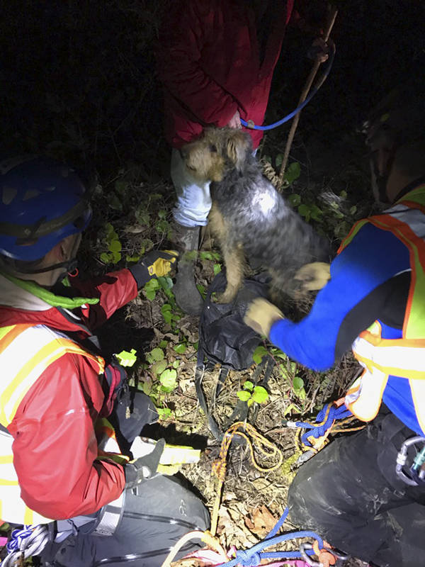 Clallam County Search and Rescue was called to the scene to assist with retrieving the dog safely. Search and Rescue has the training and gear to repel down to the dog.