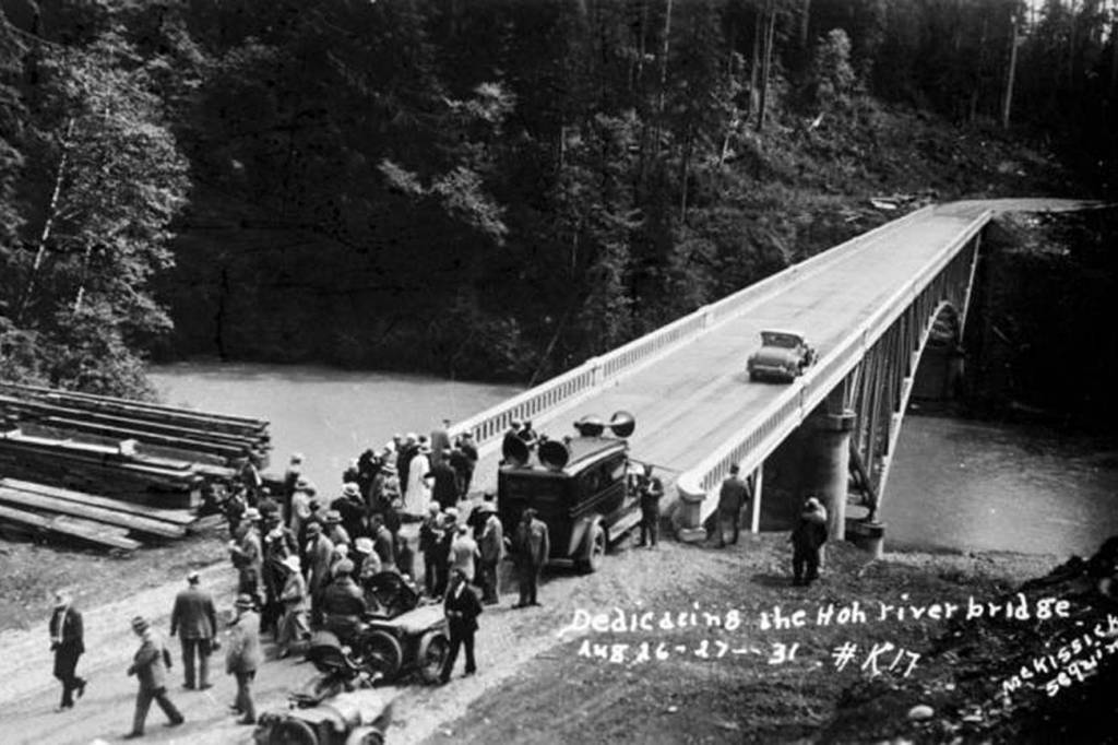 Traffic has increased significantly across the Hoh River bridge since 1931. The loads carried across the bridge have evolved from steam donkeys to feller-bunchers. The bridge remains as narrow as the day it was built. It has spawned legends. Like the story of the log truck that met a bull elk on the bridge. The bull was outweighed by more than a few tons. He decided to jump off the bridge. A feat that has yet to be duplicated.