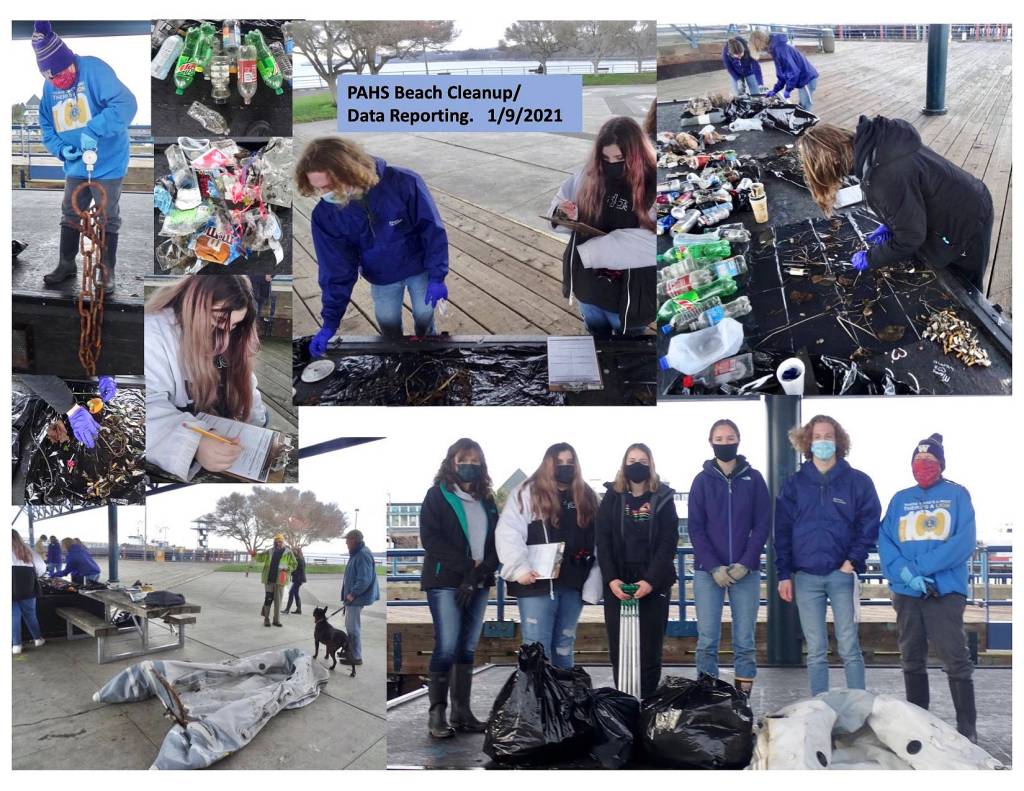 On the day of the Cleanup, the students were well organized with health-dictated restrictions during the pandemic. Working with the City of Port Angeles, they designated an area of downtown beach to be cleaned. Students were divided into two teams, the morning group picking up marine debris and the afternoon group sorting, categorizing and counting the items of marine debris.