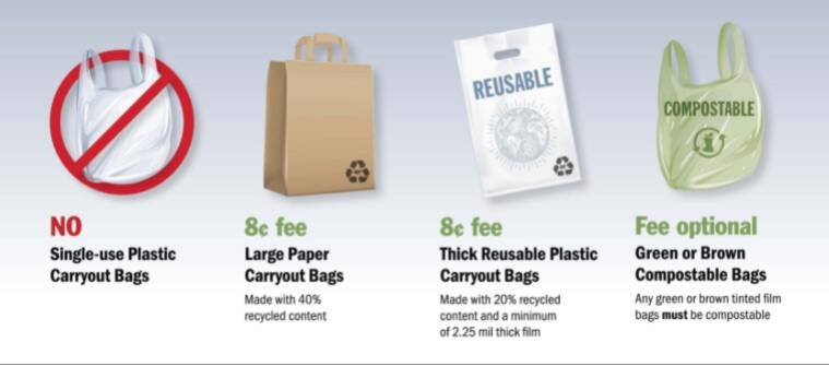If customers choose to use compliant plastic or paper bags offered by a merchant, the law requires the business charge 8 cents per bag. That 8-cent-charge is not a tax; it is a sale kept entirely by the merchant to provide an incentive for customers to bring their own bags and to recoup the costs for the more durable compliant bags.