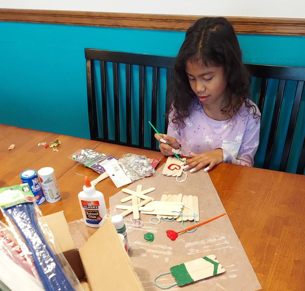 The first thing I did was go to Chinook Pharmacy to get all the craft supplies I would need to make everything. Picking out the colors was super fun. First I made popcorn strings, I may have eaten a lot of the popcorn meant for the tree, but that’s only fair since I did the work, right? That one is easy, just string a needle and thread and poke it through a piece of plain popcorn. I only made a few strings, I had my assistant (daddy) do most of them. I also made some paper chains, those are easy, just staple rings of paper together. My other assistant (mommy) did most of those. I also made ornaments from felt, paint, popsicle sticks, paint, and glue. I liked the elf I made in Mrs. Echeida’s class the best because it was the cutest. It sits at the top of the tree just below the star.