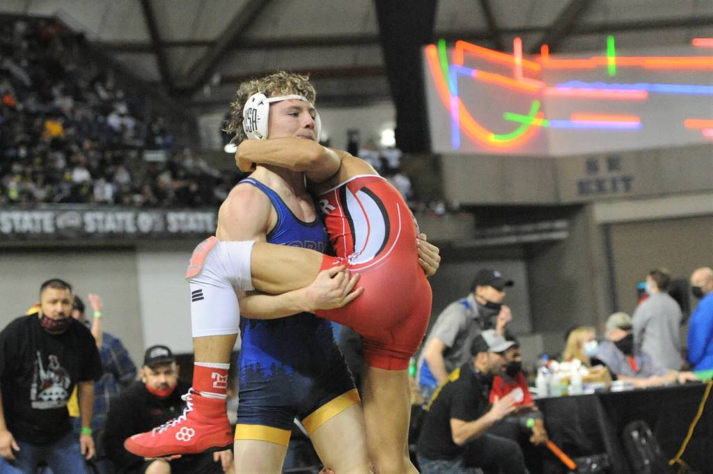 Forks’ Walker Wheeler (back) placed third at state in the 138 lb class.