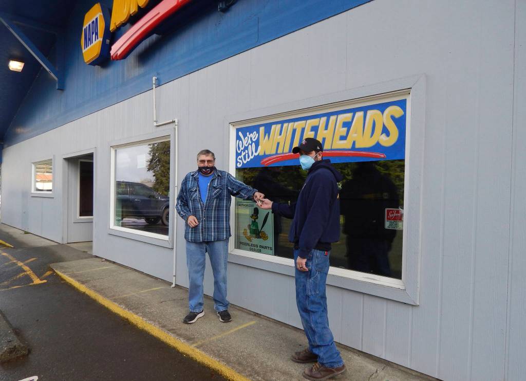 The passing of the torch or more like the keys was recreated by Victor Whitehead and his son Jonathan last Friday as the next generation will take over the operation of the longtime Forks business. Photo Christi Baron
