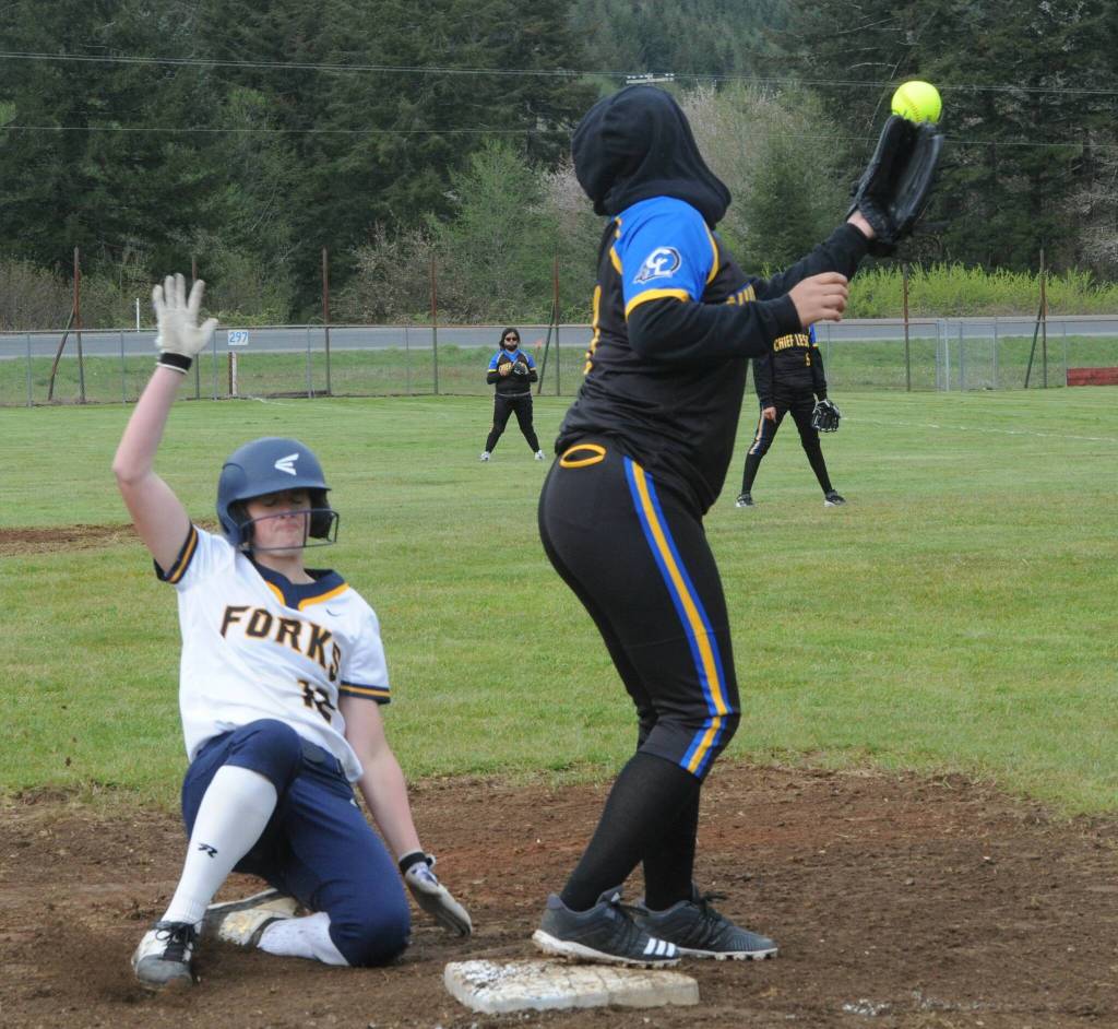 Forks’ Chloe Gayideski-St. John slid safely into third base against Chief Leschi in a doubleheader which turned into a rout in favor of the Spartans.