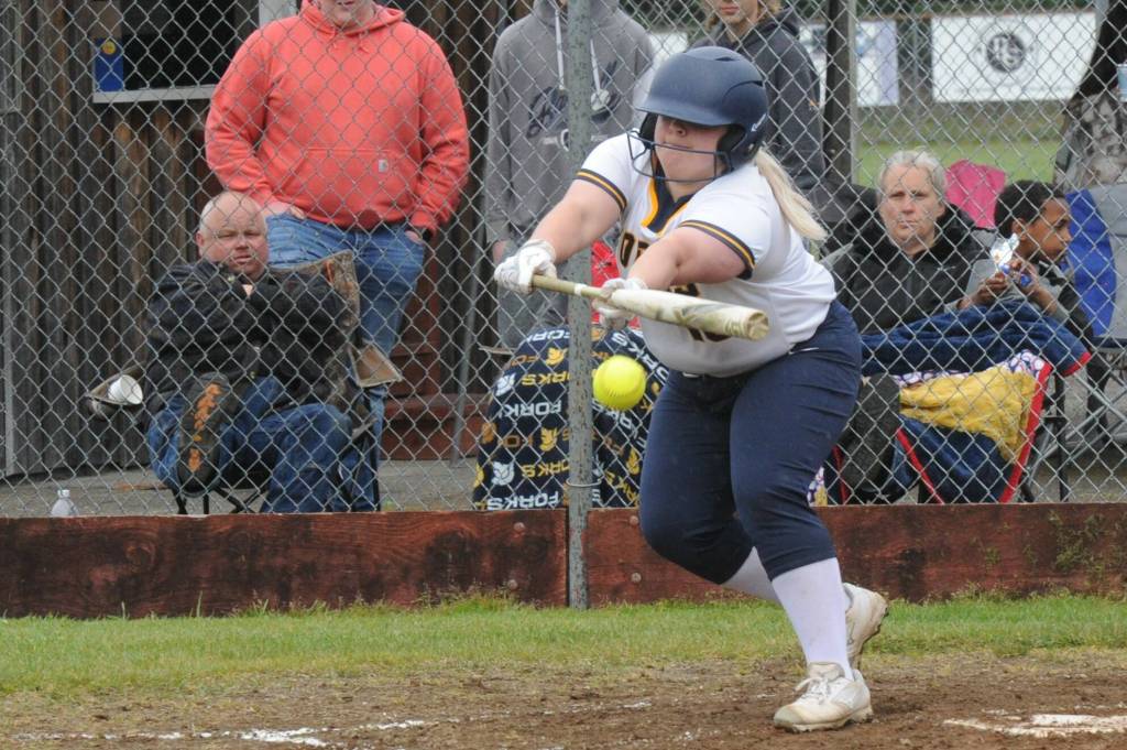 Spartan Nicole Winger bunts during a doubleheader played Tuesday, May 3 at the Fred Orr Memorial Park in Beaver. Forks took both games 17 to 0 and 28 to 0 against Chief Leschi of Puyallup. Photos by Lonnie Archibald