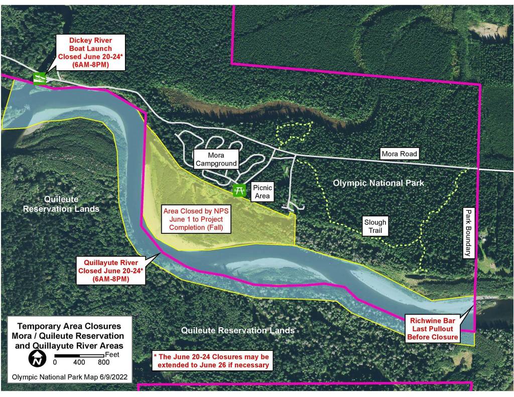 The project includes installation of large wood structures and excavation of high-flow pilot channels. The project will take place mostly on tribal trust land but a portion of the project will occur within Olympic National Park near Mora Campground. Campers and visitors in the Mora area should expect intermittent noise from construction on weekdays during the summer and from helicopter flights during daylight hours beginning June 20 through 24. Helicopter flights may extend into the weekend to June 26 depending on weather. The project also requires the following closures: