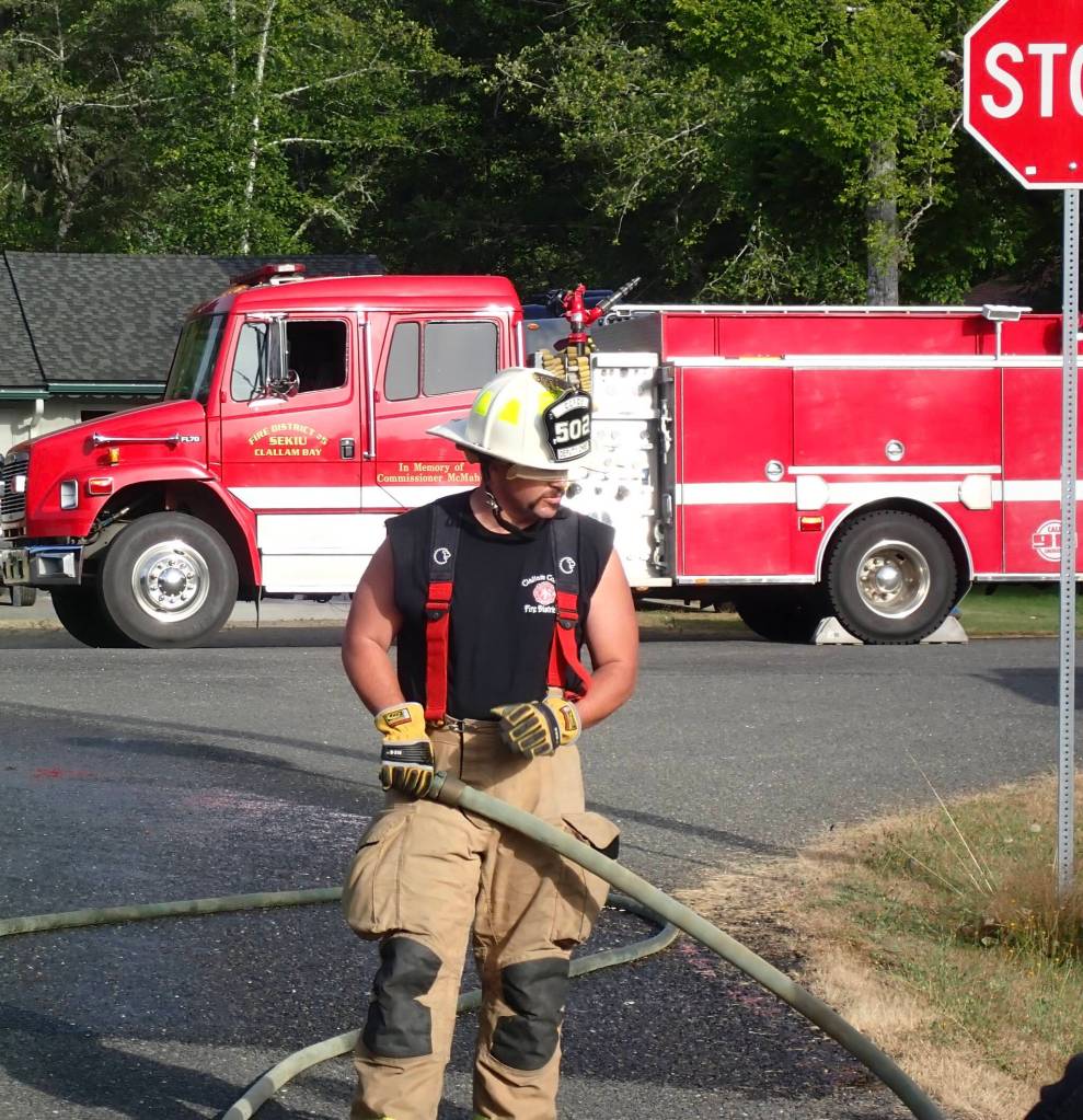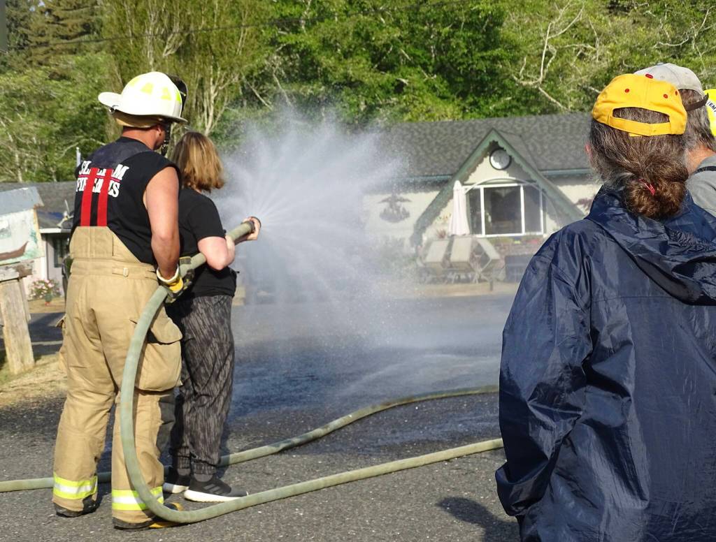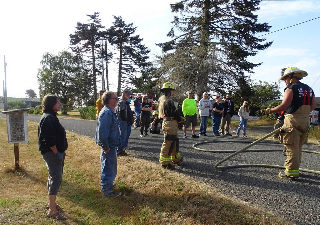 On Aug. 9, the Clallam Bay Volunteer Fire Crew came to the San Juan Vista neighborhood and conducted an orientation for neighbors on the use of the fire hoses and fire emergency procedures. The group opened the fire hose boxes, stretched out the hoses, attached them to the hydrants and tested them. Neighbors asked lots of questions and some chose to spray the hoses to get the hang of it. Neighbors are grateful to Deputy Chief, Adam Campbell and the crew for their time and expertise.