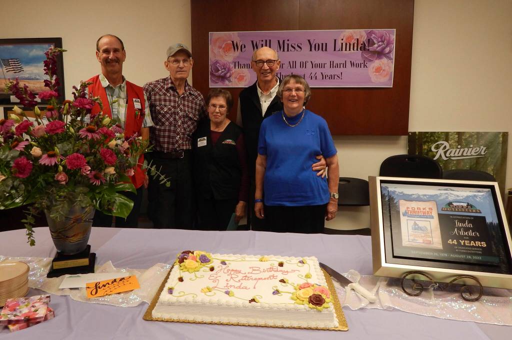 After 44 years of dedicated service to Forks Outfitters, Linda Arbeiter’s last day was on Sunday. On Friday, shaking her head, Linda was brought into the store’s breakroom where store employers, employees and her husband Phil were all waiting to surprise her with a retirement party.