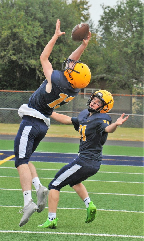 Ryan Rancourt (13) made this interception in front of Kaleb Blanton (11) during this one-on-one practice.