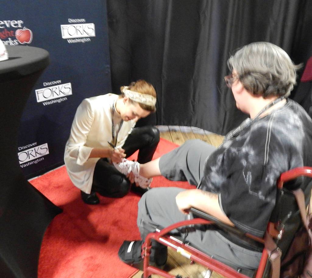 Anyway even though I am not a fan I do volunteer each year for a few hours here and there. This year I did a walking history tour downtown …Twilight fans want to know everything about Forks. I also spent a few hours at the photo and autograph session on Friday; taking photos of fans with the three Twilight movie actors.