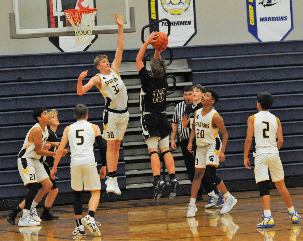The FMS has begun the boy’s basketball season. The 7th grade won in a nail-biter 31 to 29 while the 8th, after a slow start, made a comeback but lost to Sequim 44 to 35. Pictured here are photos of the 8th-grade contest by Lonnie Archibald.