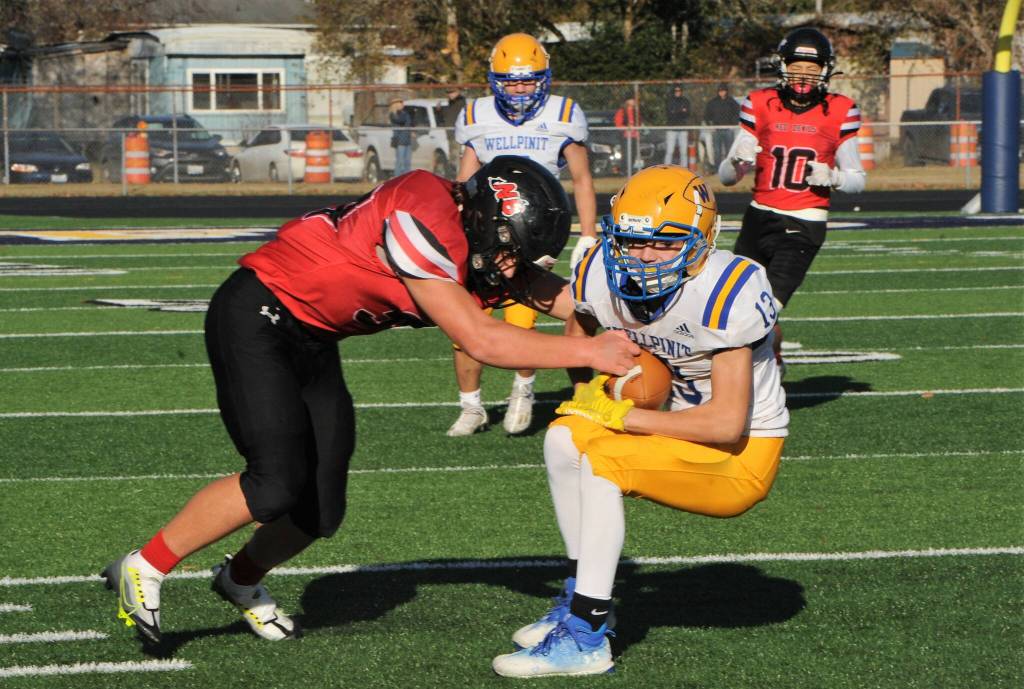 Just as importantly, the Red Devils kept Wellpinit quarterback Smokey Abrahamson in check. Wellpinit likes to throw the ball a lot for a 1B team with Abrahamson primarily targeting his 6-foot-2 receiver, Colin Hughes. Wellpinit ran the same play time and again, high passes to Hughes running sideline routes, with Hughes leaping up to try and get the ball.