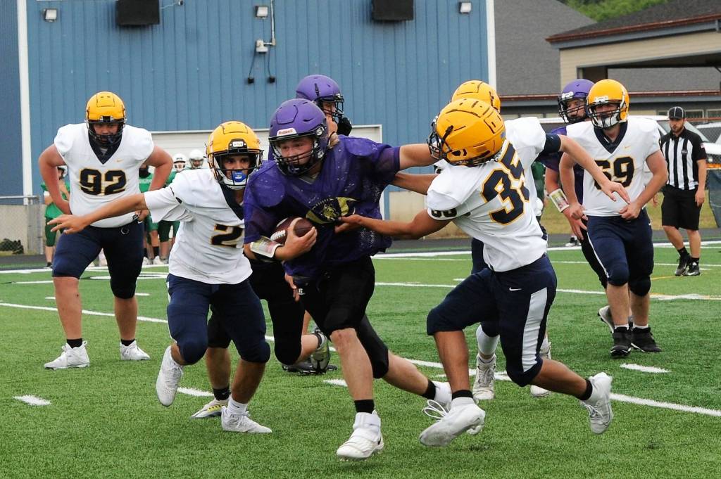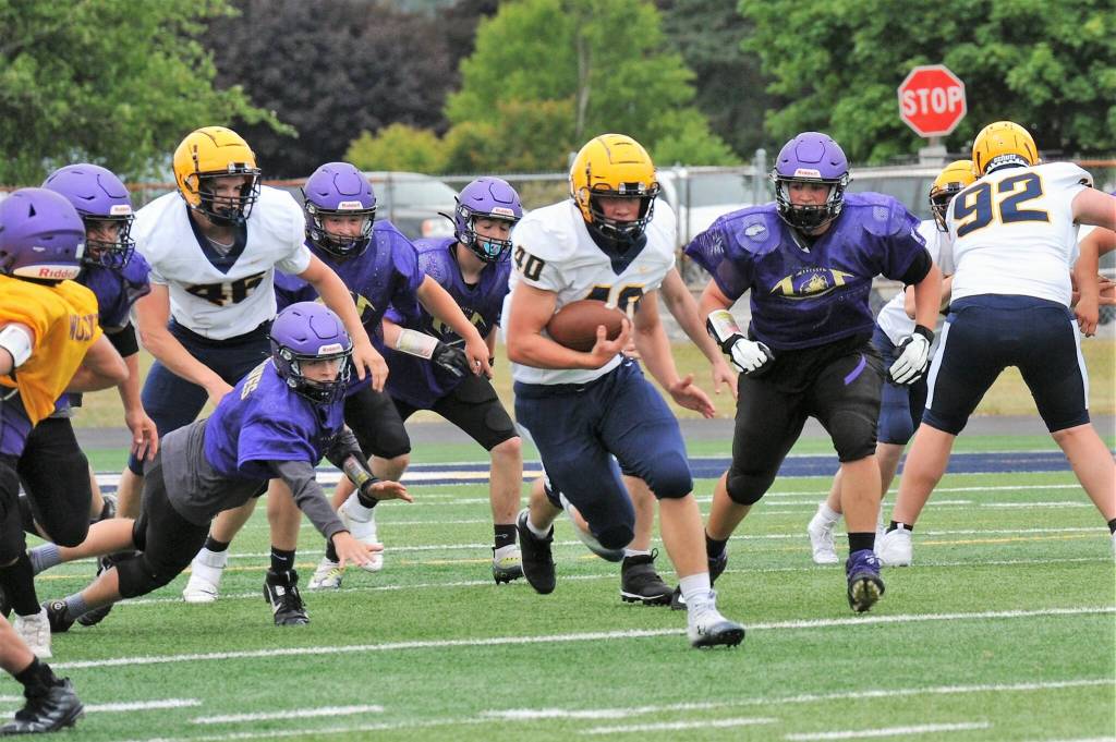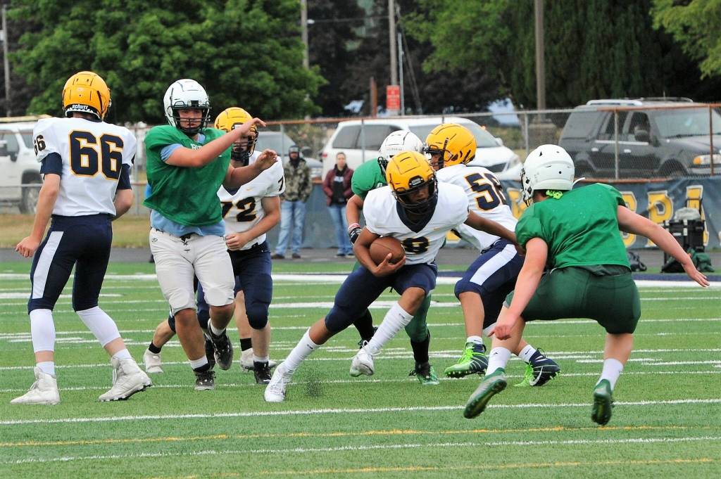 Forks, Port Angeles, and Sequim met on the turf of the new Spartan Stadium Thursday evening for a scrimmage. There was lots of action as teams showed their running, passing, blocking, and defense abilities. No scoring was kept on the scoreboard, however.