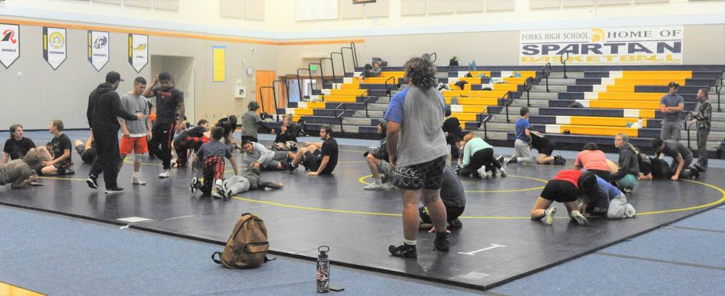 This older group of wrestlers were learning wrestling maneuvers at Spartan Gym Thursday morning. Photo by Lonnie Archibald.