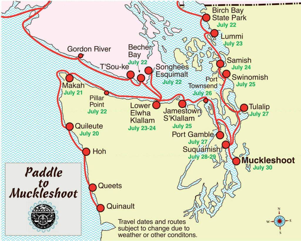 On July 23, canoe families from the West End and Vancouver Island will arrive in Port Angeles for two days hosted by the Lower Elwha Klallam Tribe before heading east. Families are expected at Jamestown Beach on July 25 and in Port Townsend on July 26.