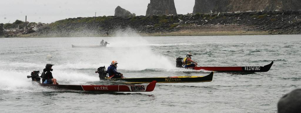 There were Rooster tails along the Quillayute Saturday as the outboard-powered dugout canoes took to the waters during the Quileute Days celebration. Photo by Lonnie Archibald