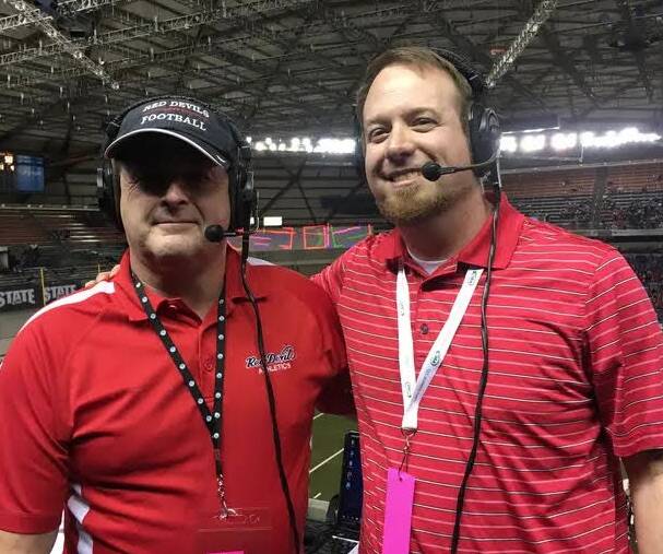 Dave Montgomery, right, is seen here at the Tacoma Dome broadcasting the Neah Bay State Championship football game with Oly Archibald on Forks Radio. Submitted Photo