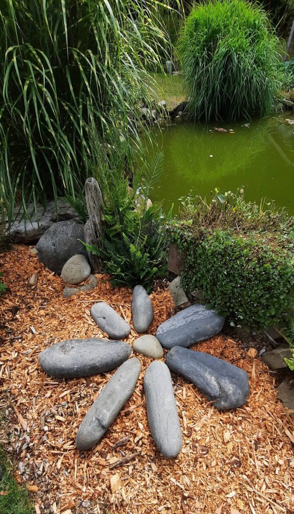 While there is much work and love put into the yard, there is also a shaded bench near the pond to rest and just listen to the water, enjoy playful goldfish, and find peace. No garden is complete without some hardscape. Large oval stones were placed in a daisy design near the pond …after all, no one ever had to weed a rock.