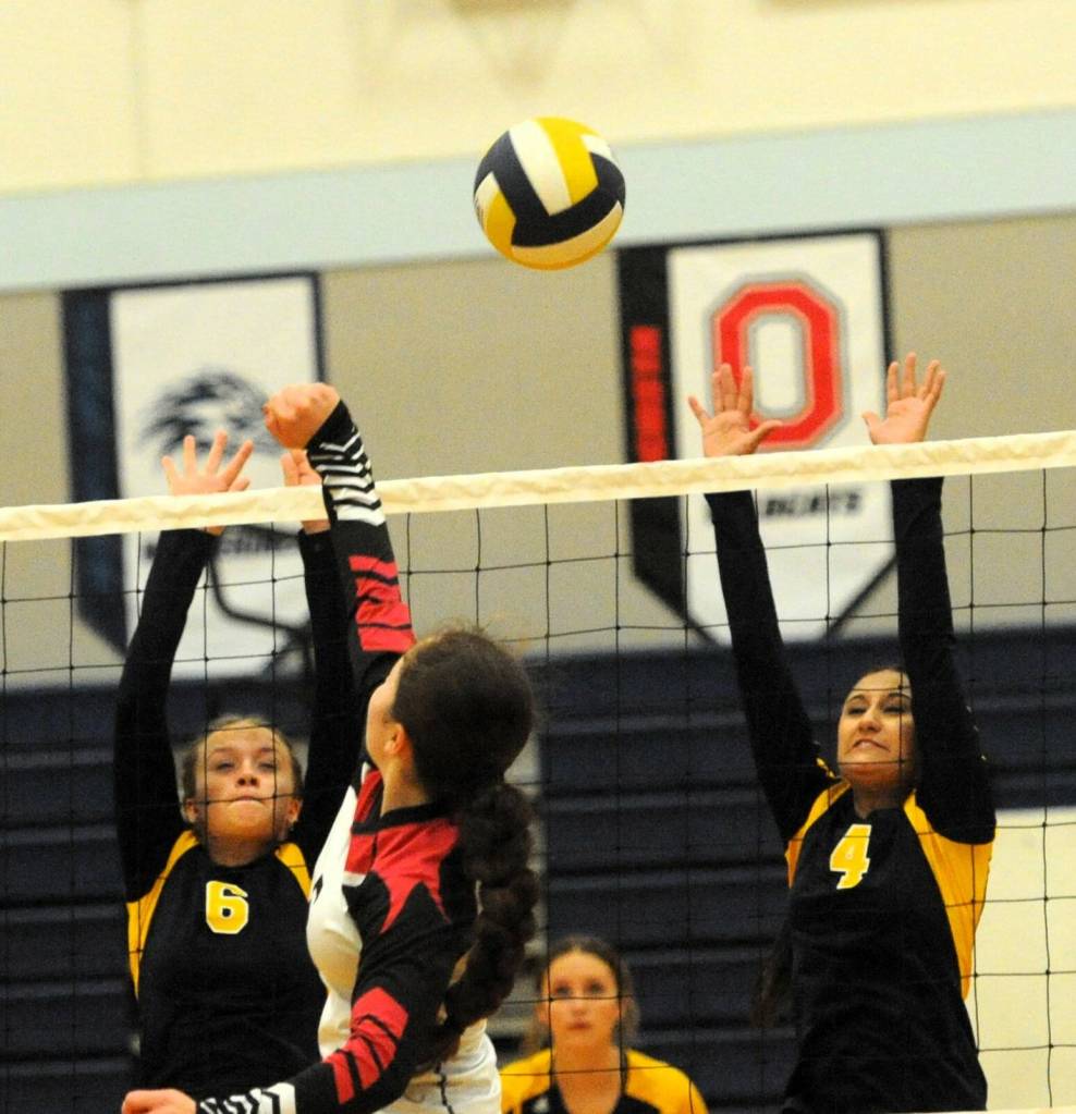 In JV volleyball action Tuesday, Sept. 26 Spartans Riley Tjepkema (6) and Kailani Gorum (4) go for the block against Neah Bay who Forks defeated 2 to 1. Photo by Lonnie Archibald