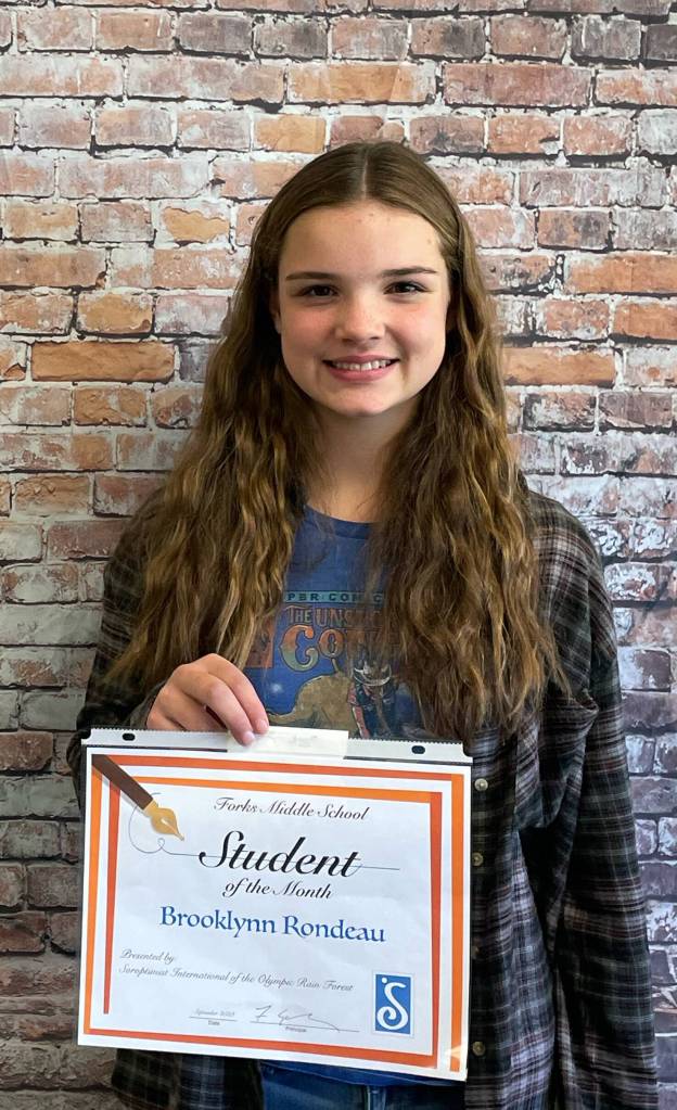 Brooklynn likes school because her friends are in school. Also because it is a place she can learn things that she does not learn at school or in sports. Her favorites include the colors baby blue and pink, blueberry casserole, dogs, and sports. Her favorite subjects are math and PE. Brooklynn has set a goal of getting on honor roll all 4 quarters this year. One teacher said, “Brooklynn Rondeau has been phenomenal in leadership class. She is always the first to volunteer to help without even knowing what she is going to be asked to do.” Another teacher said, “Brooklynn Rondeau works hard on her schoolwork. She is active in Student Leadership and athletics. She is challenging herself this year by taking an accelerated math class. I can always count on her to do her best and participate in classroom discussions. Brooklynn is very well organized.” She would like to thank her family for supporting her! Keep up the good work Brooklynn!