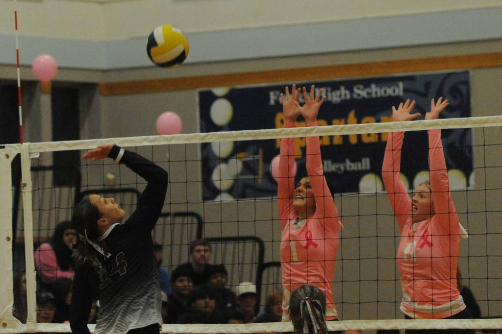 Spartans Erika Williams (left) and Keana Rowley go for the block of a Raymond-South Bend hit Oct 17 in the Spartan Gym as Forks wears pink in awareness of cancer. The Ravens took three straight sets by very close scores. Photo by Lonnie Archibald