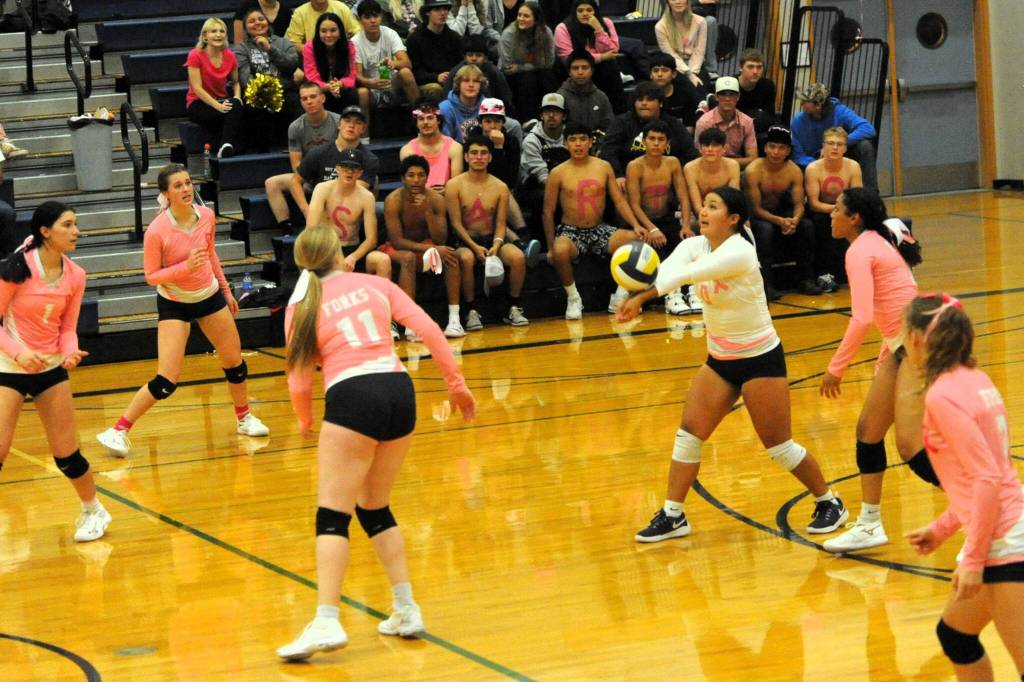 Forks’ Elizabeth Soto hits against the Ravens Oct. 17 in the Spartan Gym where Raymond-South Bend took three close sets from Forks. Also pictured are, from left, Erika Williams, Chloe Gaydeski, Keana Rowley, Eladia Hernandez-Stansbury and Karee Neel. Photo by Lonnie Archibald