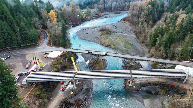 The new girders are now in place, on the Elwha bridge project. WSDOT reports that the next part of the project will entail crews building out the bridge deck, building the abutment walls that attach on each side of the bridge where it meets the land, and then tying in the bridge to the existing highway.