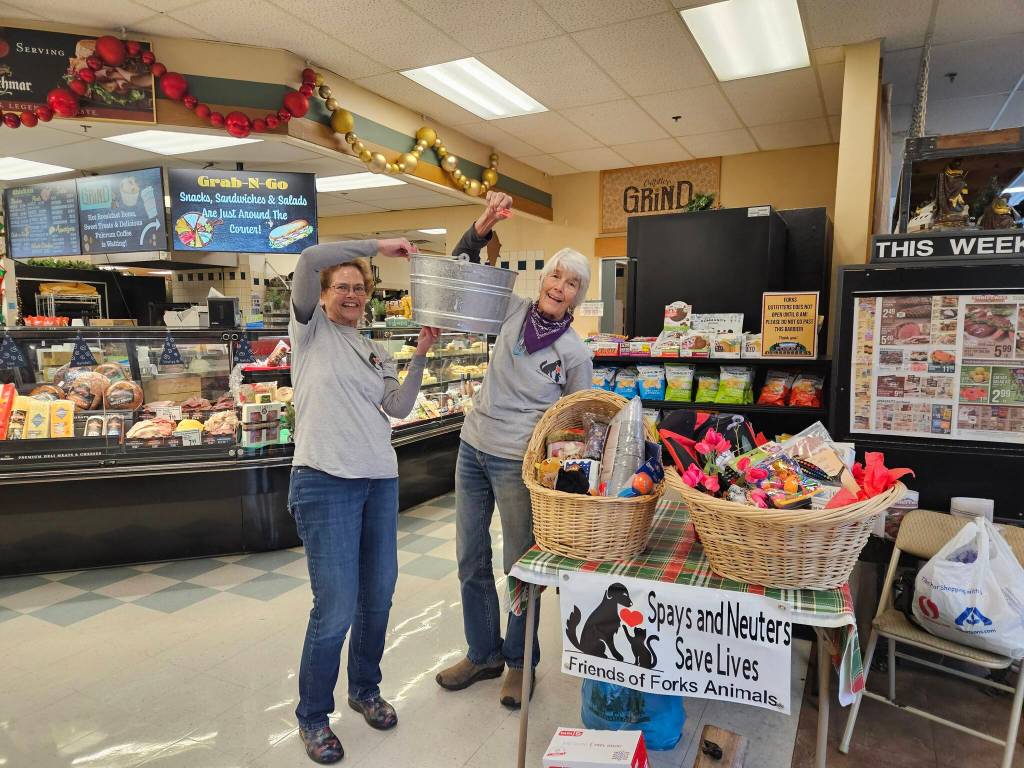 Friends of Forks Animals members Juanita Weissenfels and Gig Kerr draw the winning names on Dec. 9. And the winners were: Dog basket: Josie Hainstock, cat basket: Marky Adams, human basket: Jannell Schuller
