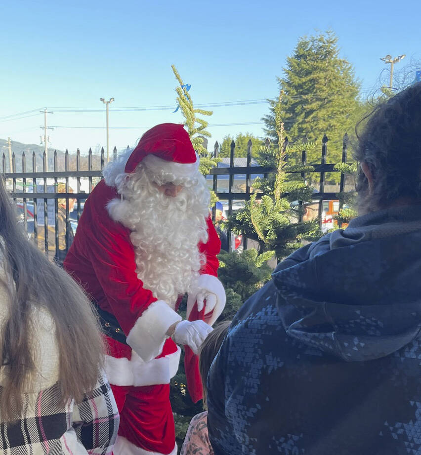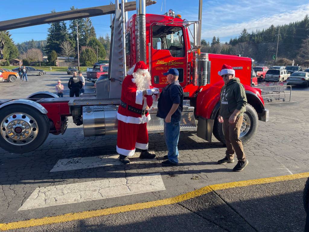 Santa arrived in a red sleigh …in the form of a Dilley and Soloman log truck! The truck was escorted into Outfitters parking lot by sirens and lights courtesy of WSP Trooper Johanson. At the wheel of the truck was Jake Jacoby. Coming to the assistance of Santa as he got ready to greet the crowd are John Witherspoon and Bruce Guckenberg.