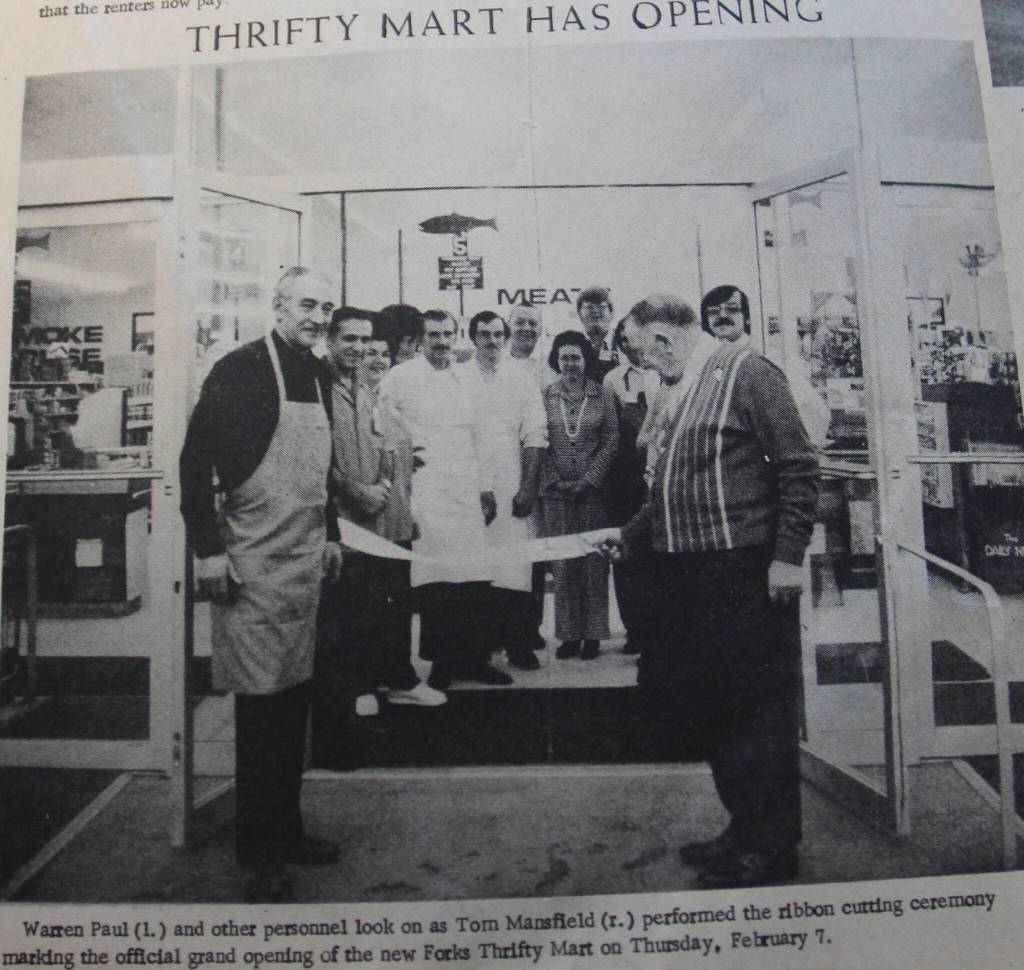 In 1974 it was Grand Opening time for the new Forks Thrifty Mart as it officially opened for business. Warren Paul and Tom Mansfield had cut the ribbon on Thursday, Feb. 7, 1974. (photo) Forks State Bank was expanding to the north. FHS senior drill team members were recognized at the last basketball game; Connie, Elda, Patti and Judy and their drummer Mike Nichols. Also recognized were the senior cheerleaders; Darlene, Marion, Christi, Jo Marie, and Debbie.
