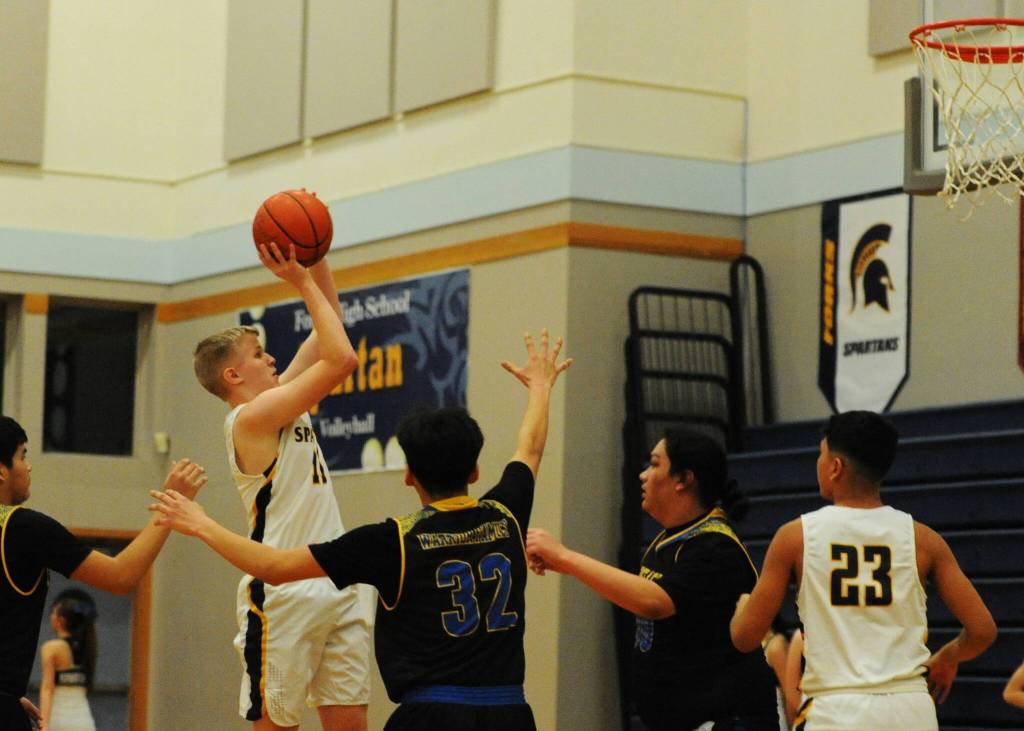 In JV action, Spartan Ayden Johnson puts up a shot against Chief Leschi Jan. 29 in the Spartan gym prior to the varsity game in which the lights went out. Forks won this one 66 to 33. Also in the action is Forks Kaden Ward (23). Photo by Lonnie Archibald