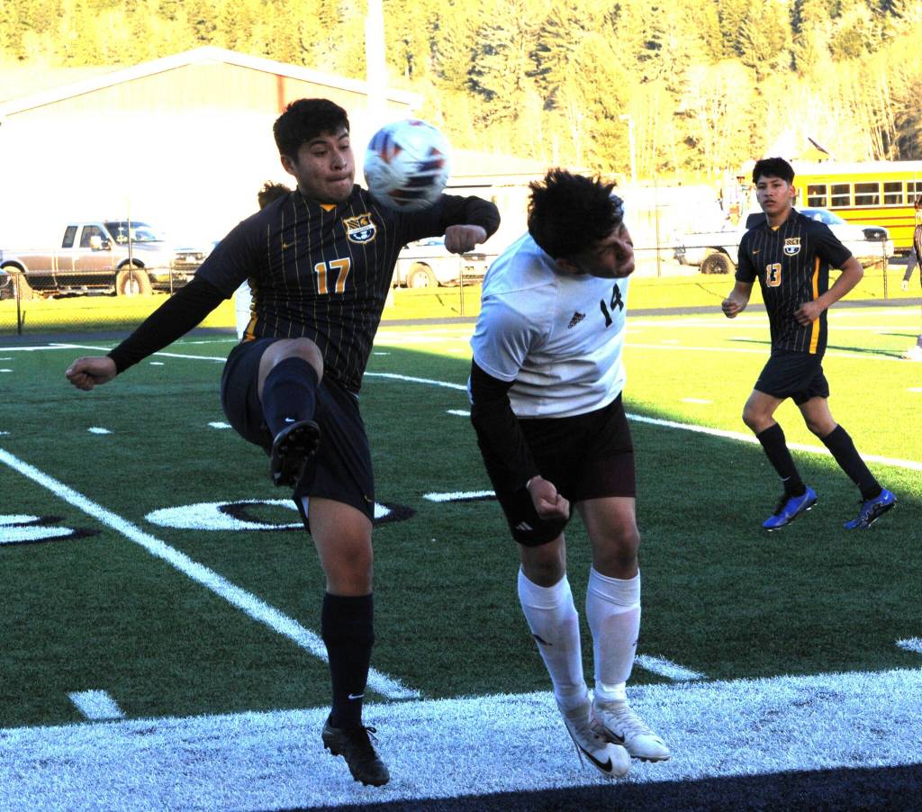 Spartan Kevin Udave Ramos (17) competes with Ravens Michael Numez for ball control on April 17 at Spartan Stadium where Raymond/South Bend defeated Forks 1 to 0. Looking on is Forks Mateo Lucas. Photo by Lonnie Archibald