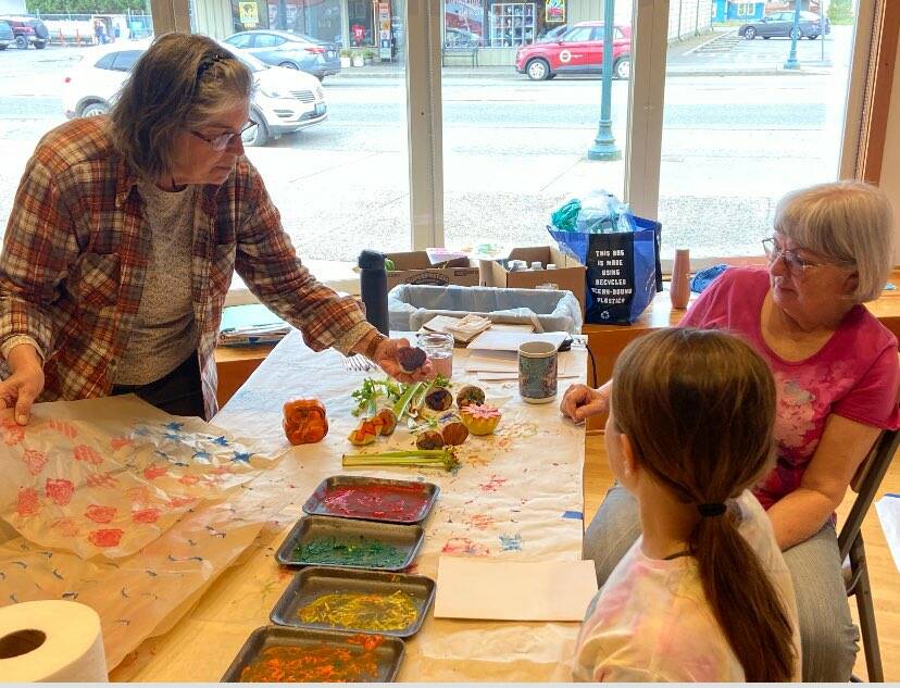 Debbie Anderson and Linda Offutt assist with a kid’s art activity of stamping with fruit at the RAC during Rainfest.