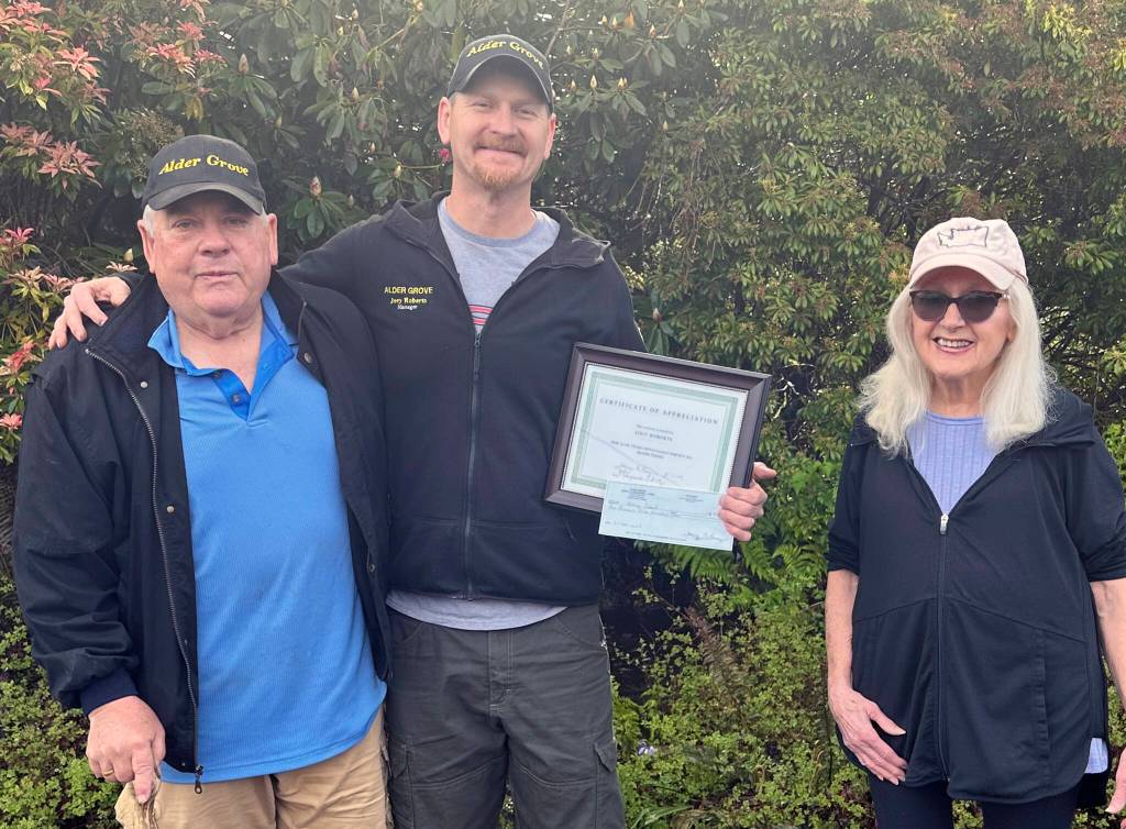 Jerry and Margaret King recently presented Joey Roberts, manager of Alder Grove Mobile Home Park, a twenty-four-year award and a $2,400 bonus for his dedication to Alder Grove. Joey started working for Alder Grove as a high school senior and started full-time after graduation.