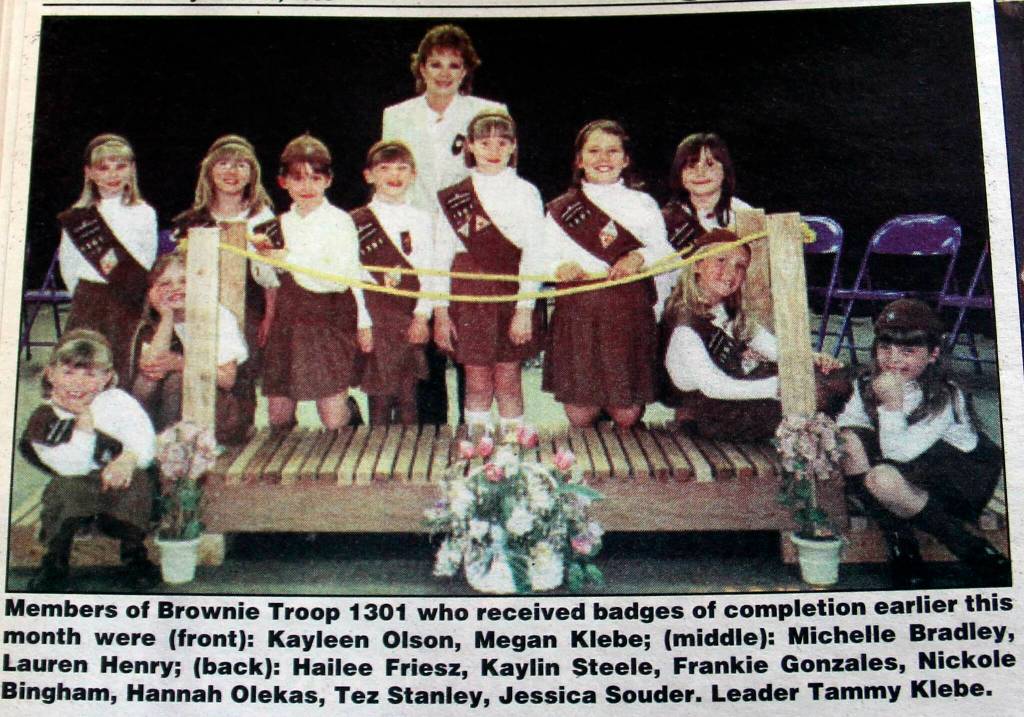 This week in 1999 the Forks Lions Club had named Marcia Bingham as their Citizen of the Year. Brownie Troop 1301 received badges of completion and their photo in the paper (photo). Lindsey Poole was heading to Europe to compete as part of a National USA Track and Field Team.