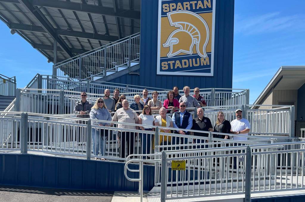During the tour, the group visited the Spartan Hall of Fame decades display, the Spartan Gym, wrestling and weight rooms, the biomass building, Spartan Stadium, and the new stadium bathrooms. Reaume shared future plans, including new turf and an area for high school fastpitch and baseball fields beyond the new Spartan field.