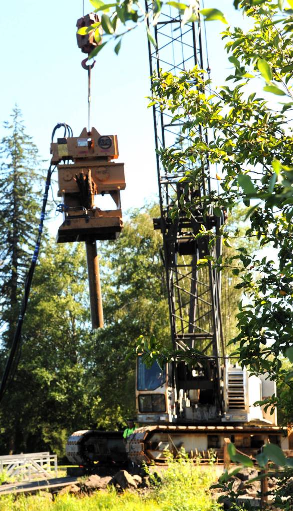 Quigg Brothers, Inc. of Aberdeen began removing the old pilings from the Clallam County Park at Lake Pleasant on Tuesday, July 16. Photo by Lonnie Archibald